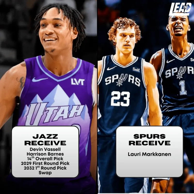 ——马刺送出瓦塞尔、巴恩斯、2025年14号签(已经选中卡特布莱恩特)、2029年首轮、32年首轮互换