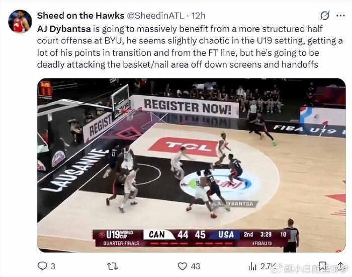 迪班萨这场最强一战引来美媒的盛赞:迪班萨在高中联赛上半场进攻又战术存在巨大有优势,来到U19表现有些混乱主要依靠快攻、造犯规拿分,不过他在低位借掩护顺下攻框的效果很好。